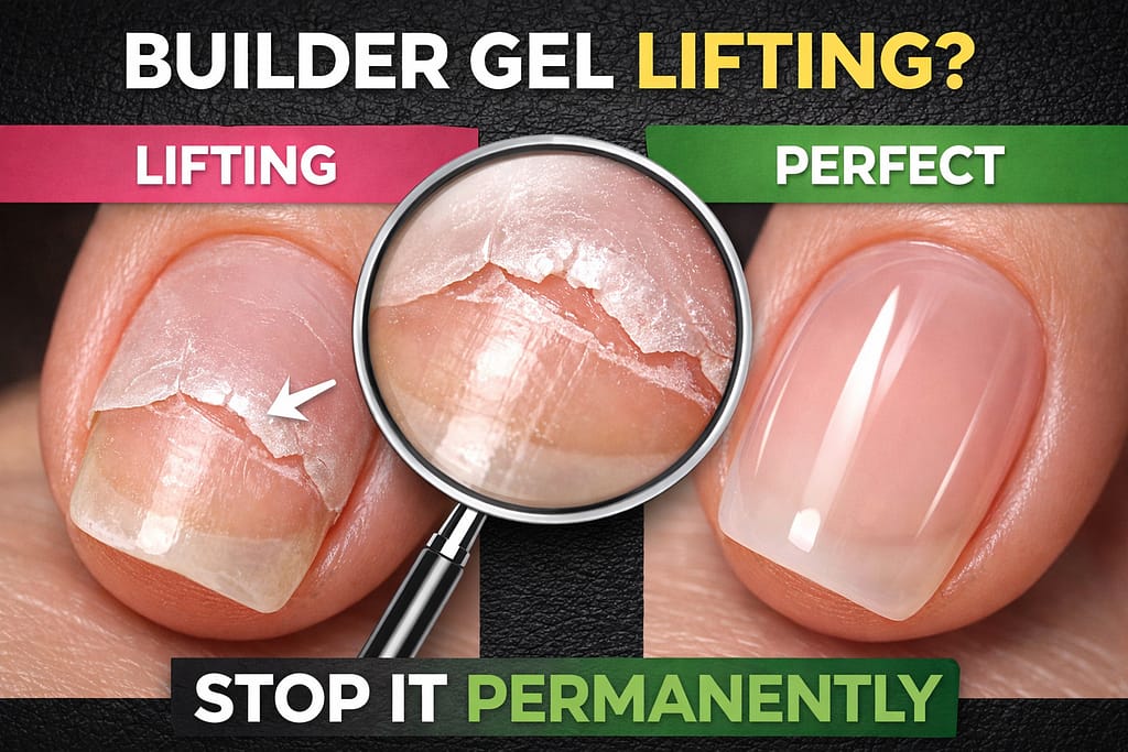 Builder gel lifts because of a mismatch between product behavior and nail conditions — not just “bad prep.” The fix depends on where the lifting starts: cuticle lifting = adhesion or cuticle film issue; free-edge lifting = sealing or structural failure; full-plate lifting = cure or contamination problem. Scroll to the Quick Diagnosis Table to identify yours in 60 seconds.