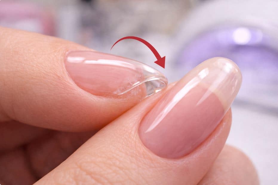 When the nail becomes too thin near the base, it bends more easily. A rigid product applied over a thinned plate cannot maintain stable bonding.